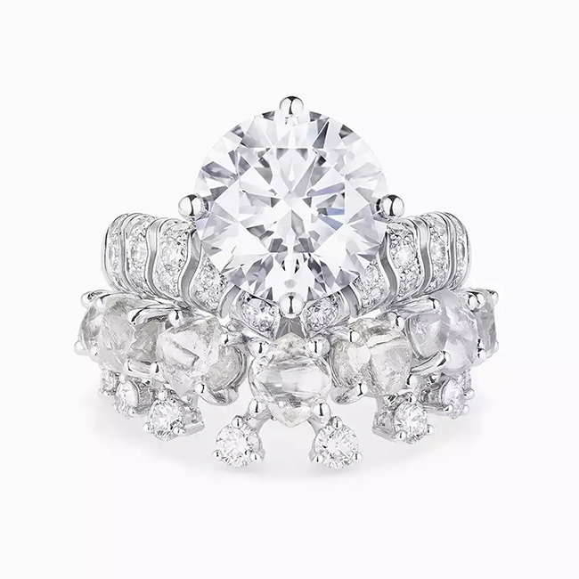 Кольцо — символ природной гармонии. В центре кольца сияет бриллиант круглой огранки весом 5,21 карата, отличающийся безупречным цветом D и исключительной чистотой. Изогнутая шинка кольца украшена чередующимися круглыми и необработанными бриллиантами. Грубая текстура необработанных камней создает завораживающий контраст с блеском ограненных бриллиантов, подчеркивая естественную и сверкающую красоту.