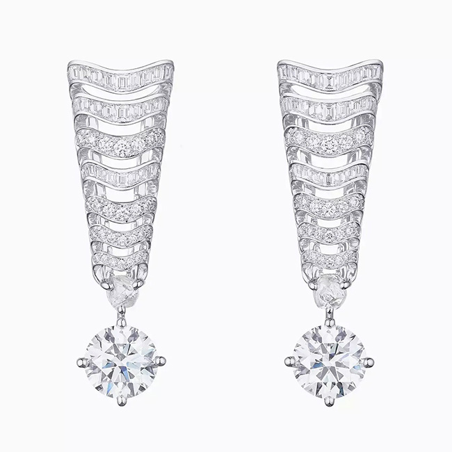 Серьги — струящаяся элегантность. Серьги украшены бриллиантами различных размеров, создавая эффект струящегося водопада. Изюминкой является бриллиант круглой огранки весом 3 карата у основания, напоминающий мерцающую каплю воды.