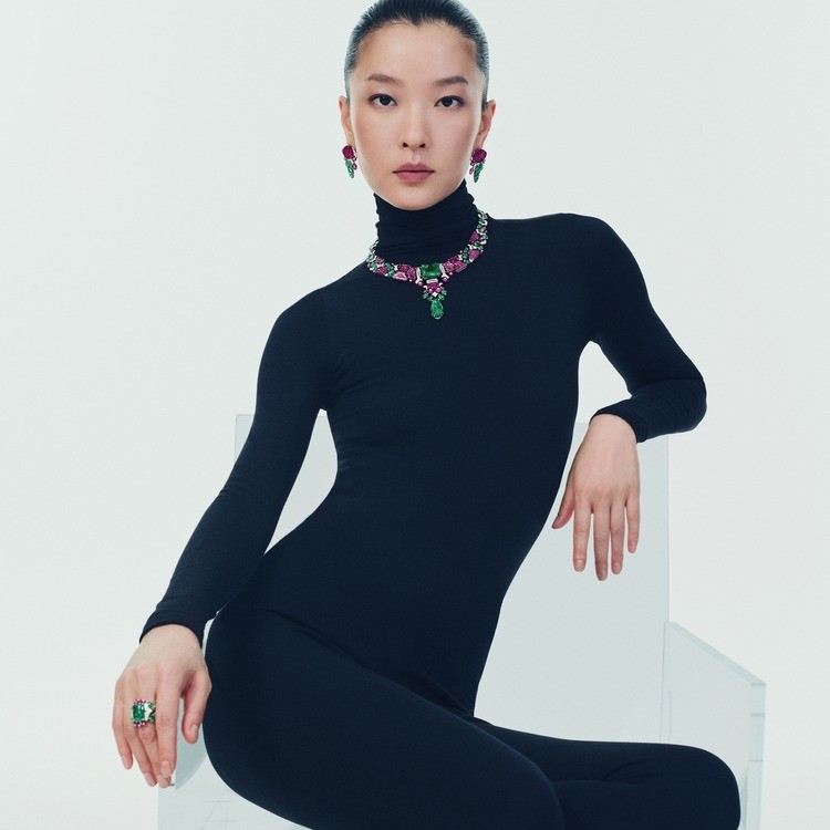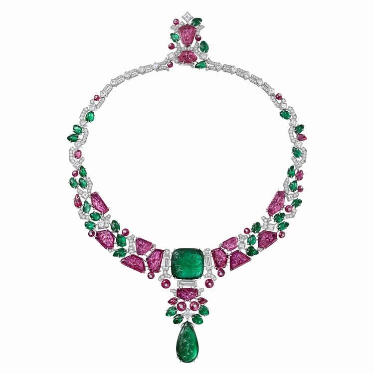 Этот ювелирный гарнитур Cartier «Tutti Frutti» из коллекции En Équilibre High Jewelry 2025 года воплощает образ природного ландшафта, где растительные формы — вьющиеся стебли и расползающиеся побеги — оплетают архитектурные конструкции. Исполнение основано на изумрудах и рубинах, декорированных цветочными и листовыми мотивами, что является прямой отсылкой к культовому стилю индийских ювелирных изделий эпохи Великих Моголов (XVI–XVIII века), известному своей резьбой по камню (кабошон, багет, калибра-cut).