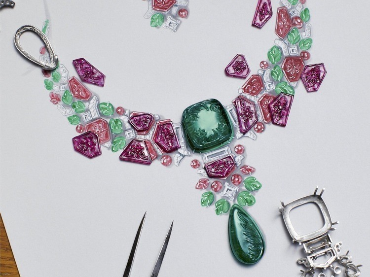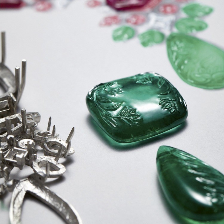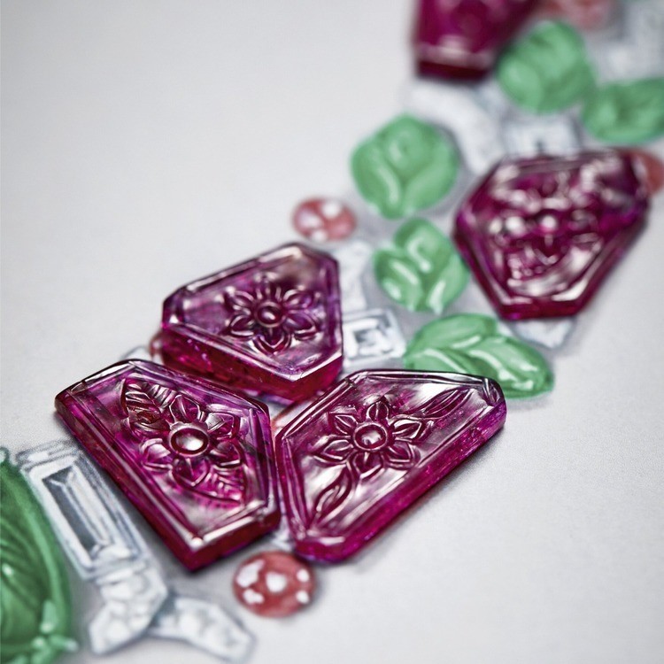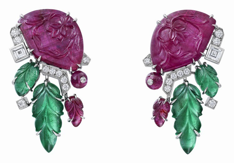 Серьги украшены двумя резными рубинами с цветочным узором в качестве центральных камней, а ниспадающие резные изумруды и рубины, вырезанные в виде листьев, излучают яркую, почти осязаемую жизненную энергию.