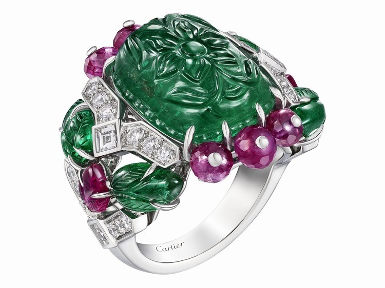Кольцо декорировано резным изумрудом с цветочным узором в качестве центрального камня; по бокам расположены шесть рубиновых бусин, обеспечивающих яркий цветовой контраст. Переход кольца осуществляется к резным изумрудам с листовым узором, в то время как сверкающие линии бриллиантов (огранка «багет» и «круглая бриллиантовая») переплетаются, имитируя стебли лиан.