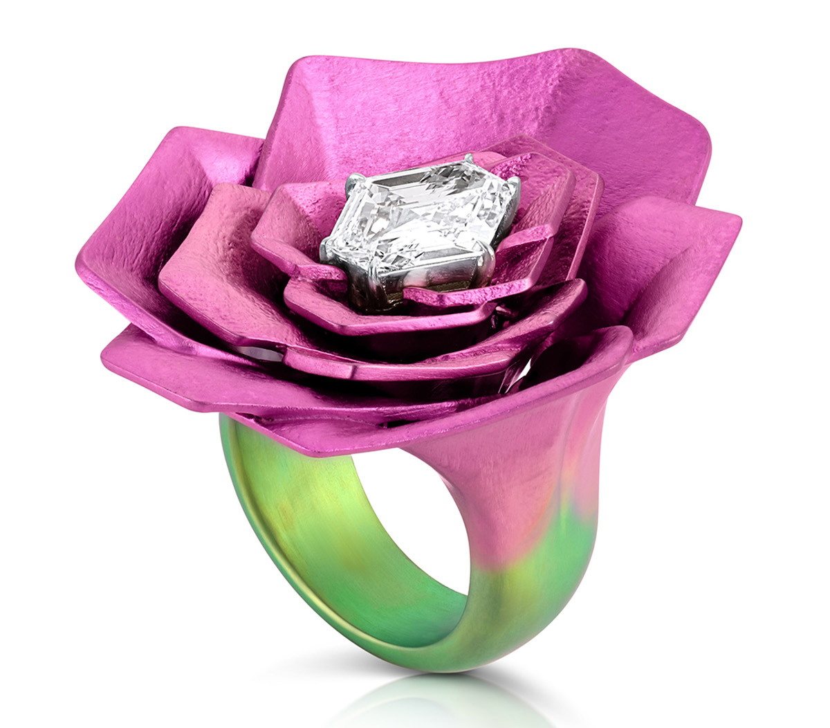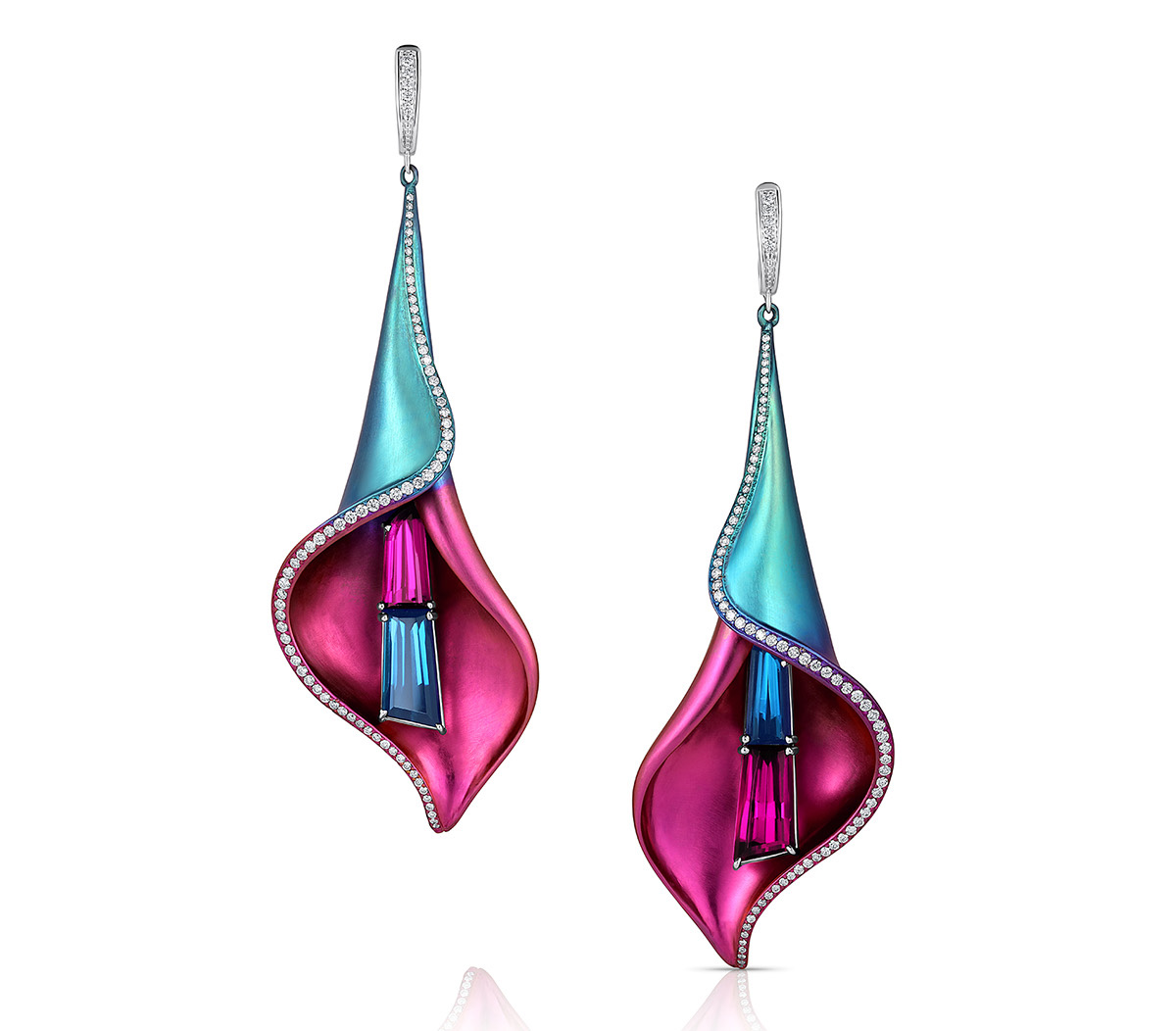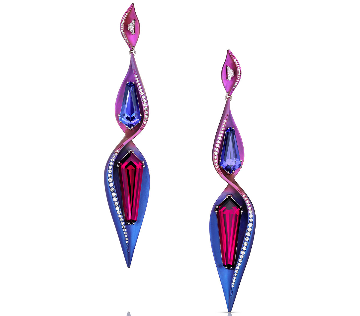 Титан выступает объединяющим материалом всей коллекции: он анодирован в оттенки от пыльно-розовой бронзы до градиентов синего, фиолетового, розового и зелёного, воссоздавая палитру снов Нили.