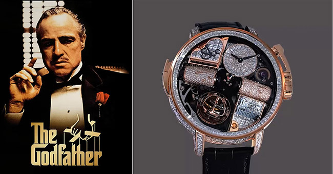 Представьте себе: почти 1100 бриллиантов, сверкающих на корпусе из 18-каратного розового золота. Но это только начало. Внутри этих часов скрывается нечто поистине волшебное – миниатюрная музыкальная шкатулка. По нажатию кнопки она оживает, воспроизводя 30-секундный отрывок из культовой заглавной темы фильма. А в центре этого музыкального чуда – крошечная, но детально проработанная фигурка самого Дона Корлеоне, воплощенного Марлоном Брандо. Миниатюра Дона Корлеоне напоминает его фирменный образ, дополненный красной розой и лацканом.