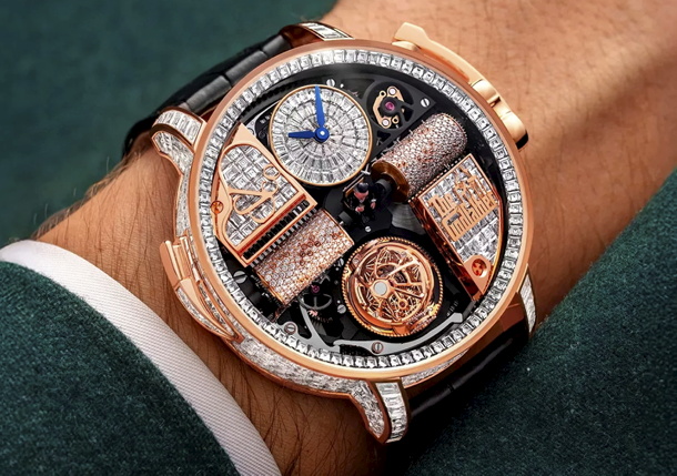 Корпус из 18-каратного розового золота усыпан 447 бриллиантами багетной огранки, общим весом около 28,68 карата. А цилиндры музыкальной шкатулки сияют 666 бриллиантами бриллиантовой огранки, добавляя еще 1,85 карата ослепительного блеска.