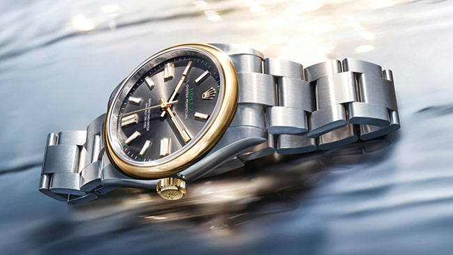 Две новые модели из уменьшенного набора Oyster Perpetual выполнены из 18-каратного золота. Модель диаметром 28 мм изготовлена из желтого золота с циферблатом, покрытым зеленым камнем, а модель диаметром 34 мм — из розового золота Everose с циферблатом, покрытым синим камнем. Обе модели имеют браслеты с сатинированной отделкой, которые придают металлу текстурную теплоту. Примечательно, что часовые метки на отметках «3», «6» и «9 часов» выполнены из натурального камня.