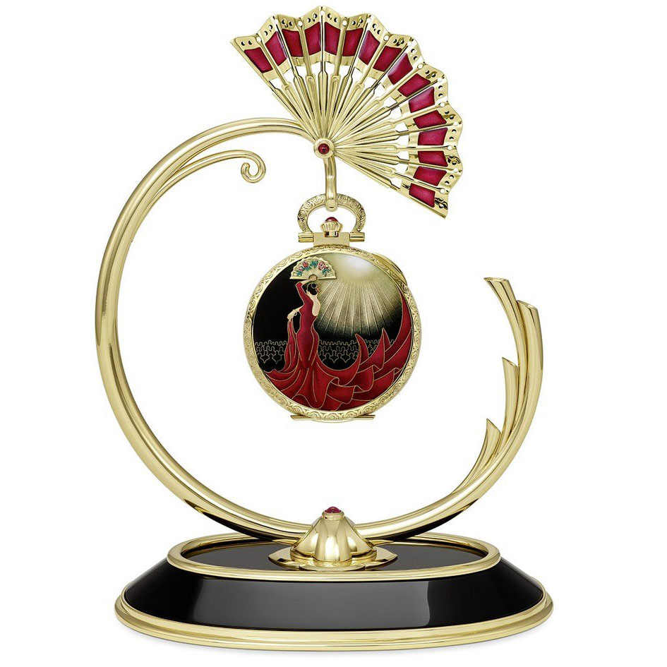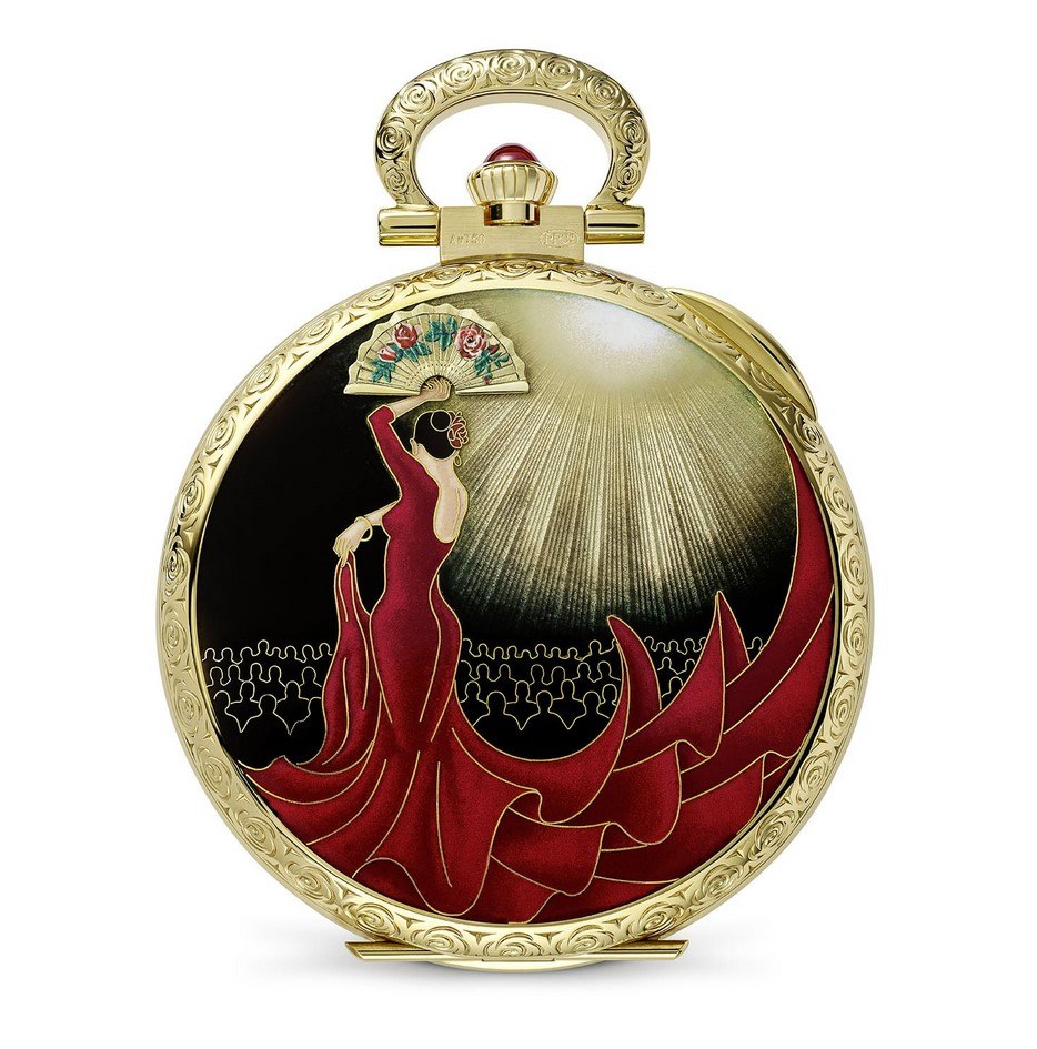 С обратной стороны изображение танцовщицы фламенко выполнено в технике перегородчатой эмали (около 50 см золотой проволоки, 13 цветов эмали, которые обжигаются 20 раз). Даже сам стенд изготовлен из полированного обсидиана и золота, открывая вид на часы со всех сторон. Внутри также установлен ручной калибр на 17 линий, но с малой секундой