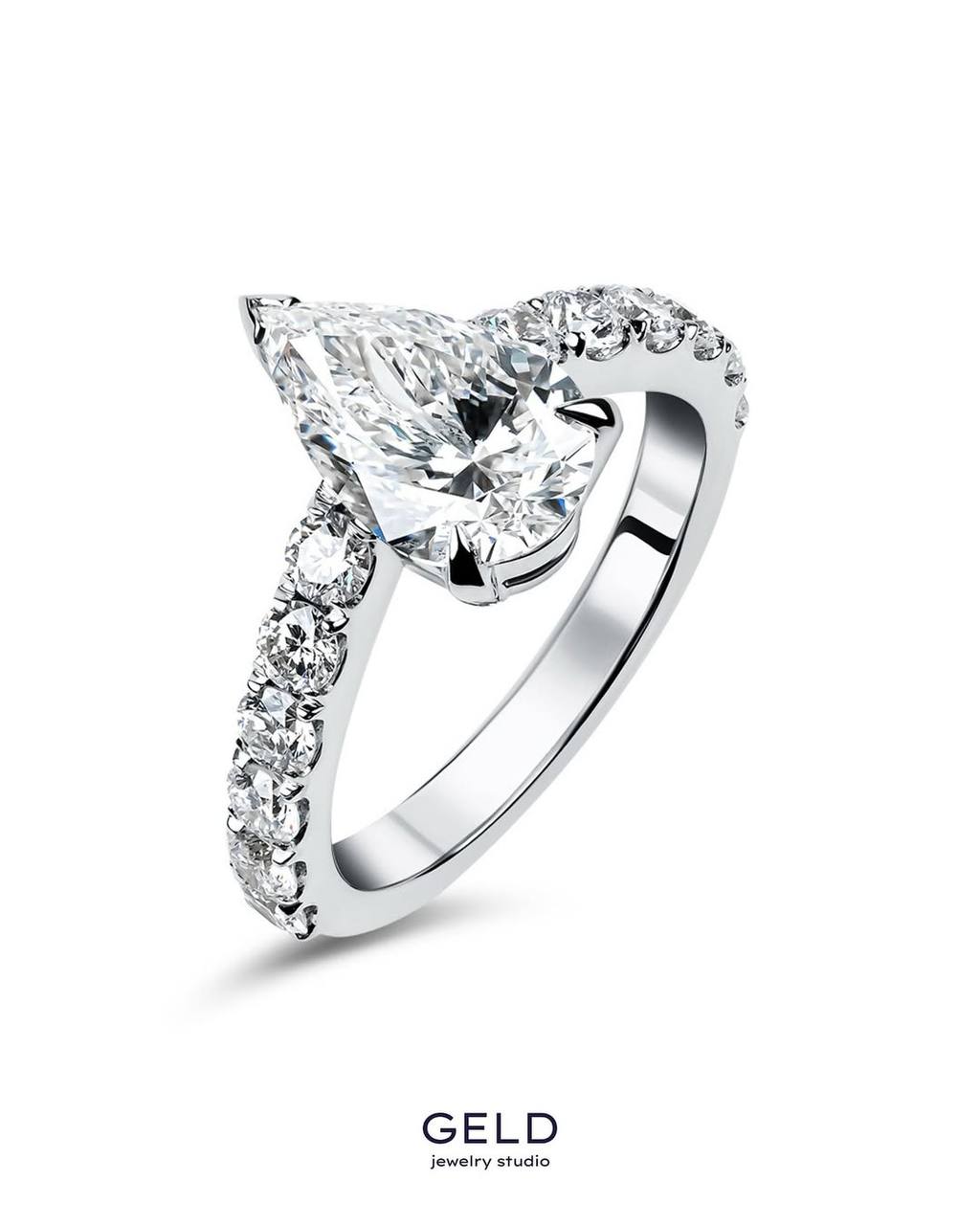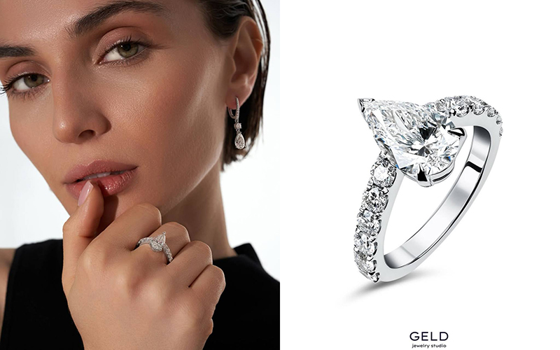 GELD Jewelry Studio представляет уникальное кольцо для помолвки, в котором каждая деталь говорит о гармонии формы, света и эмоций. Центральным элементом становится бриллиант огранки «груша» — редкой и архитектурно выразительной, напоминающей каплю, но обладающей глубокой оптической игрой. Эта форма визуально удлиняет палец, придавая образу лёгкость и воздушность, будто сама любовь скользит по коже.