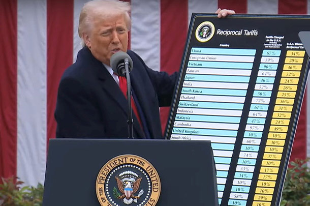 На фото изображен президент США Дональд Трамп, объявляющий о введении взаимных пошлин в апреле прошлого года.