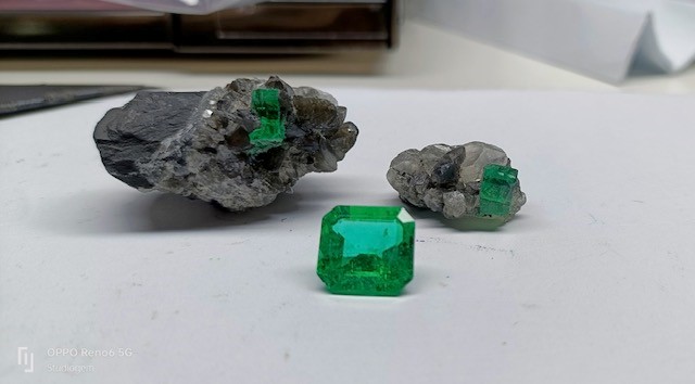 Изумруды на кальцитовой подложке и ограненный изумруд весом более 10 карат, из Музо, Колумбия. (Фото: Франческо Натале)