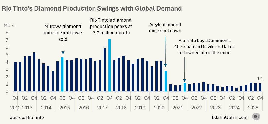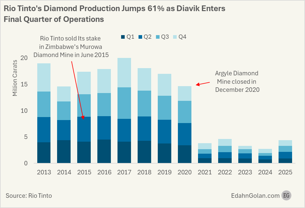 Структурный перелом произошёл в конце 2020 года с закрытием Аргайла, что привело к резкому падению квартальной добычи с многомиллионного уровня до примерно 3–4 миллионов каратов. С этого момента Диавик стал единственным источником алмазов для компании. В 2021 году Rio Tinto укрепила контроль над рудником, выкупив 40% акций Dominion Diamond Mines. Однако смена владельца не изменила траекторию исчерпания запасов: по мере приближения к концу жизненного цикла месторождения добыча неуклонно снижалась, опустившись в последние кварталы до уровня около 1 миллиона каратов и менее.