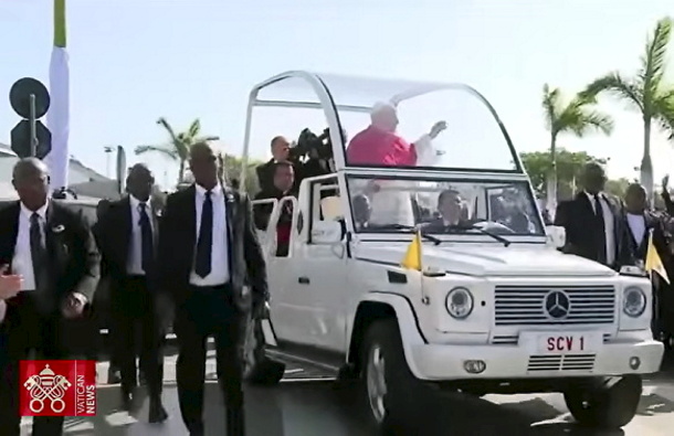 Скриншот предоставлен Vatican News, на нем показано прибытие Папы Римского в Анголу.