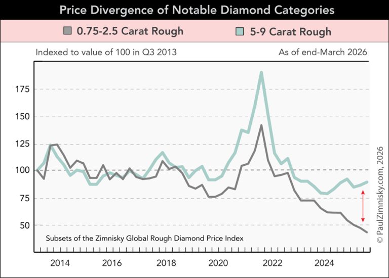 Для сравнения, согласно данным отдельных частей глобального индекса цен на необработанные алмазы Zimnisky, цены на алмазы весом 5-9 карат, как ювелирные, так и близкие к ювелирным, выросли на 10-15% с начала 2026 года. В то же время, цены на алмазы весом 3-6 гран (0,75-1,5 карата) и 2-2,5 карата снизились на несколько процентов с начала года (см. диаграмму выше).