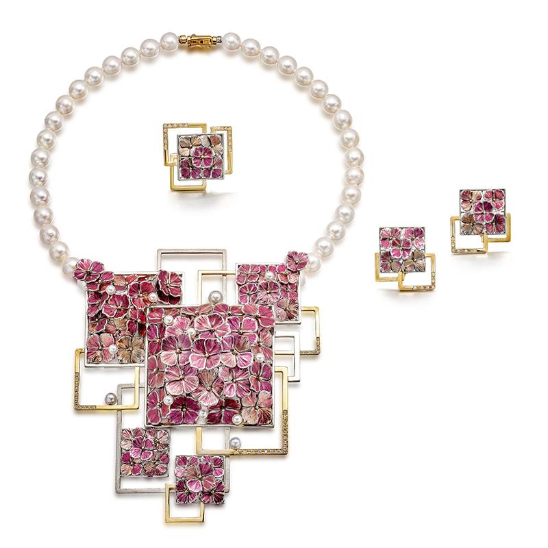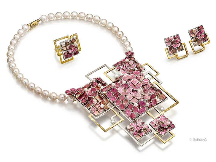 На аукционе высокого ювелирного искусства Sotheby's в Гонконге 19 сентября 2025 года был представлен ювелирный гарнитур, включающий кольцо, серьги и ожерелье, каждое изделие украшено россыпью миниатюрных цветков гортензии, искусно обрамленных платиной и желтым золотом. Подлинная инновация заключается в том, что нежные оттенки розового и фиолетового достигаются не эмалью, а использованием 18-каратного фиолетового золота. Фиолетовое золото представляет собой уникальный сплав, отличающийся от традиционных методов, где розовый оттенок достигается добавлением меди, а белое золото – никеля, серебра или платины. В составе фиолетового золота присутствует алюминий.