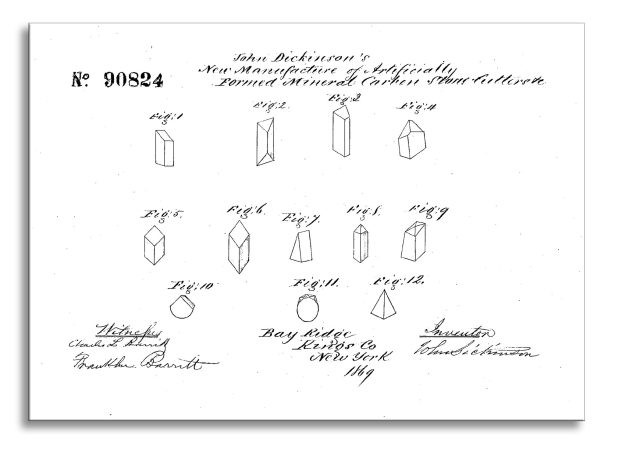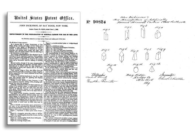 В патенте № 97,085 от 23 ноября 1869 года, озаглавленном «Усовершенствование способа получения минерального углерода для использования в искусстве», Дикинсон детально описывает обработку природного алмаза — который он именует «природным минеральным углеродом» — для получения определённых форм: наконечников свёрл, резцов и иного инструмента, предназначенного для обработки (шлифовки, распиловки, сверления) камня, металла и прочих твёрдых материалов (см. чертёж в патенте).