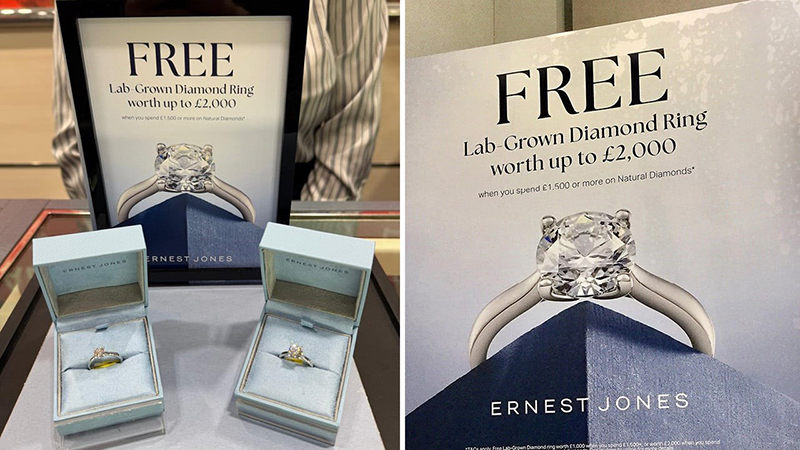 Британский ювелирный бренд Ernest Jones, входящий в состав Signet Jewelers, провел акцию ко Дню святого Валентина. Покупатели, приобретающие натуральные бриллианты, могли получить в подарок кольцо с выращенным в лаборатории бриллиантом стоимостью до 2000 фунтов стерлингов (2723 доллара США).