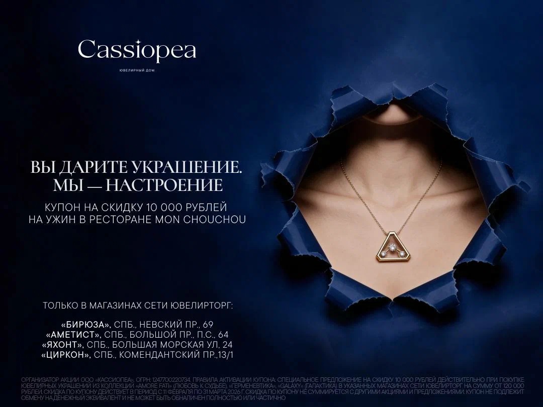 С 25 февраля по 31 марта в четырех салонах сети «Ювелирторг» («Яхонт», «Аметист», «Бирюза» и «Циркон») действует специальное предложение, которое переводит акт покупки в плоскость искусства впечатлений. Приобретая украшения Cassiopea из коллекций «Amore Fati», «Герменевтика» и «Galaxy» на сумму от 120 000 рублей, покупатель получает подарочный сертификат на 10.000 рублей в бистро французской кухни.