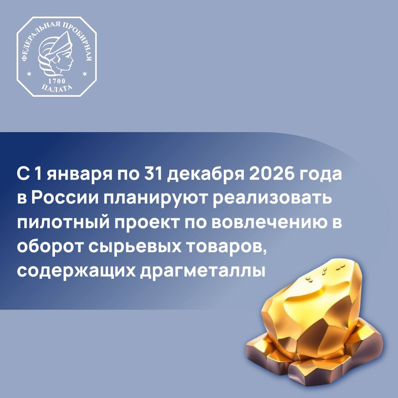 Президент РФ Владимир Путин подписал Указ Президента Российской Федерации от 22.09.2025 г. № 667 (http://www.kremlin.ru/acts/bank/52409) о запуске важного отраслевого проекта. Уже с 1 января по 31 декабря 2026 года будет реализован пилотный проект по вовлечению в оборот сырьевых товаров, содержащих драгоценные металлы. Федеральная пробирная палата вошла в число ключевых участников этой инициативы наряду с Министерством финансов РФ, Федеральной таможенной службой РФ, АО «Алмазный мир», юридическими лицами и индивидуальными предпринимателями — собственниками сырьевых товаров, содержащих драгоценные металлы.