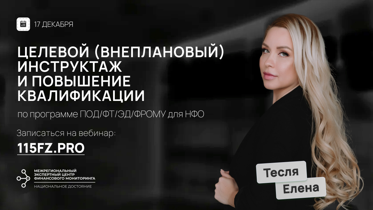 Обучение проводит – Тесля (Пинигина) Елена, юрист - эксперт по ПОД/ФТ/ЭД/ФРОМУ с опытом работы 20 лет, лауреат национальной премии «Преподаватель года по ПОД/ФТ» 2020, генеральный директор МЭЦФМ «Национальное достояние», главный редактор СМИ «Вести 115-ФЗ».