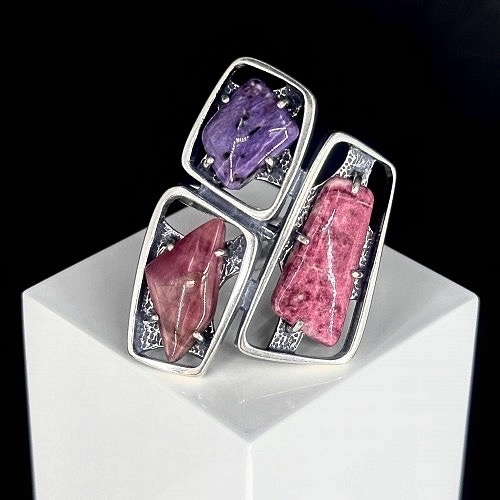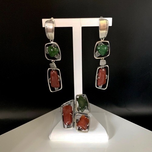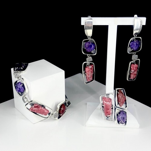 Этот комплект, состоящий из кольца, сережек и браслета, воплощает собой идею безупречной гармонии и завершенного стиля. Мастерство наших ювелиров проявилось в уникальном сочетании нескольких видов драгоценных камней, придающих каждому изделию неповторимый характер и эксклюзивность.
