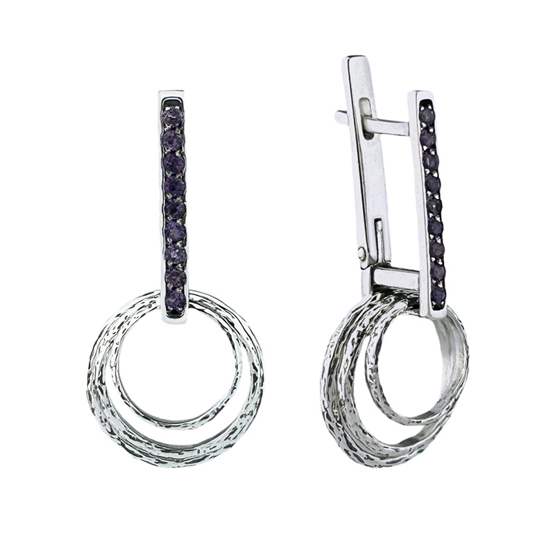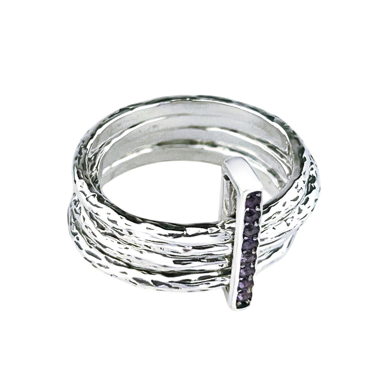 Серьги и кольцо, где серебряные колечки свободно соединены между собой изящной полоской аметистов. Камни словно скрепляют конструкцию, а сами элементы мягко движутся, шелестят при каждом движении и создают ощущение украшения с характером.
