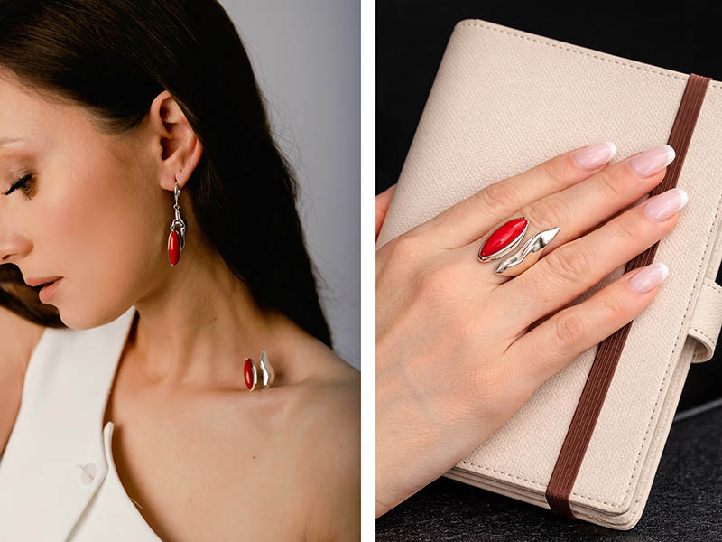 Серьги и кольцо в едином стиле — идеальный дуэт для тех, кто любит выразительные детали и уверенный образ. Глубокий алый камень в сочетании с гладким серебристым металлом создаёт роскошный контраст, который притягивает взгляды с первого мгновения.