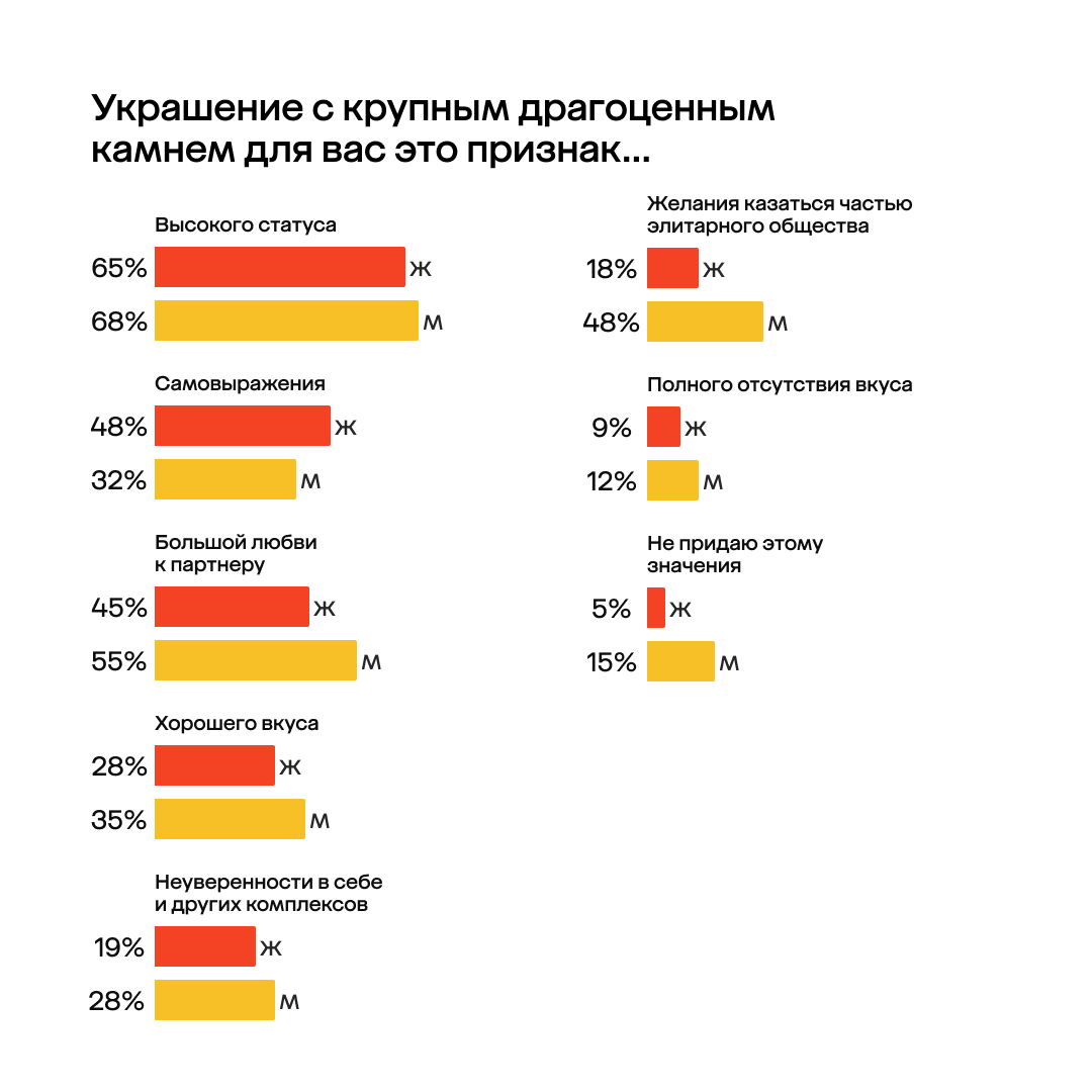 Лишь небольшая часть опрошенных женщин видят крупный камень как способ компенсации неуверенности в себе и других комплексов (19%) и желания показать свою принадлежность к элите (18%). Среди мужчин такую точку зрения разделяют 28% и 48% соответственно.
