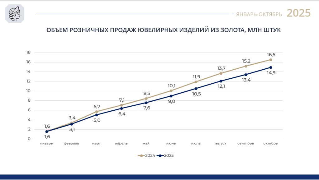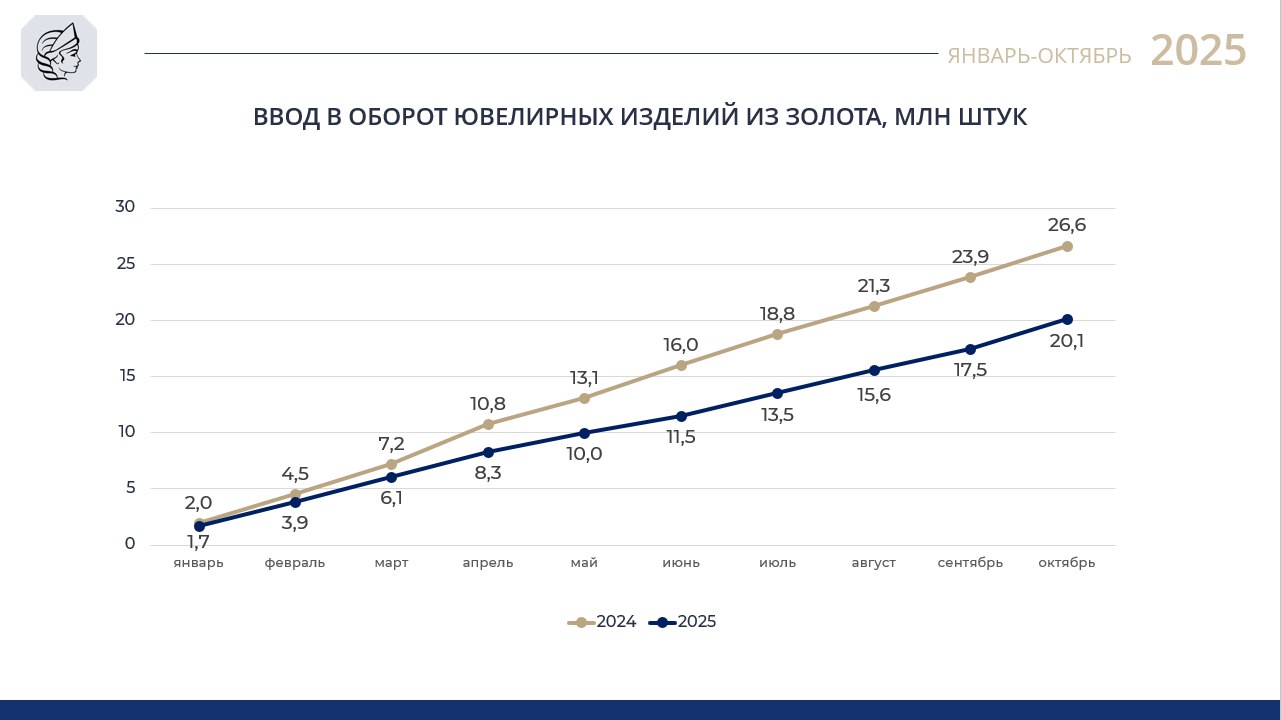 Производство ювелирных изделий из золота, январь-октябрь 2025 года:
