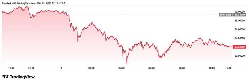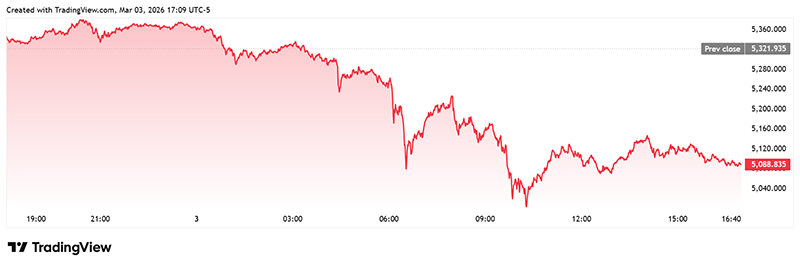 Котировки золота и серебра продолжают коррелировать с общим всплеском спроса на доллар США как на актив-убежище: спотовое золото снизилось на 4,38%, до 5088,83 доллара за тройскую унцию, а спотовое серебро упало до 82,036 доллара, потеряв 8,18% за сессию (данные на 04.03.2026).
