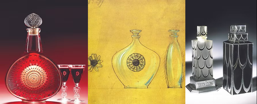 1. Графин для вина и пара бокалов Strasbourg, около 1928 г.Столовое стекло, часто в стиле высокого ар-деко, было неотъемлемой частью коммерческой империи Лалика в конце 1920-х годов, в годы Великой депрессии. 2. Замечательный рисунок флакона для духов Aster, около 1908 г. Стиль Лалика в переходном состоянии, изображенный на протяжении нескольких сантиметров и, возможно, нескольких минут, между натуралистичным и геометрически стилизованным дизайном. 3. Презентация металлического футляра для духов от Люсьена Лелонга, вдохновленных панорамой Нью-Йорка и ориентированных на американский рынок, около 1932 года.