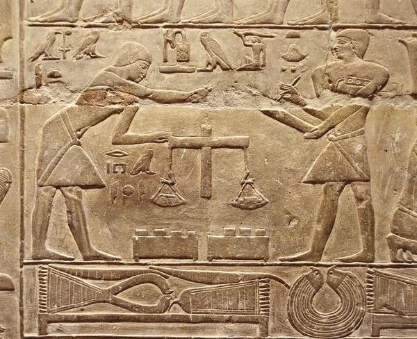 Рельеф, изображающий ювелиров, взвешивающих и плавящих золото для изготовления ожерелий и украшений, гробница Мереруки, Саккара, Египет, ок. 2349 г. до н.э. (Восточный институт Чикагского университета)