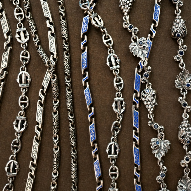 Уникальная авторская коллекция цепей "Владимир Михайлов" воплощает традиции древних новгородских и псковских мастеров. Изделия из золота, серебра и платины украшены цветной эмалью, драгоценными камнями и сложными орнаментами с христианской символикой.
