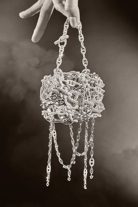 Также Арди пофантазировал с разными формами, превращая цепочку в неожиданный кафф для ушей или растягивая звено до размеров английской булавки в двойное кольцо, которое можно носить на двух или трех пальцах. Самым удивительным является минодьер – миниатюрная женская сумочка, − в котором Chaîne d'ancre обернута вокруг себя, образуя и сумку, и маленькое украшение Sacs одновременно. Минодьер выполнен из белого золота и украшен 11 668 бриллиантами общим весом 99,07 карат.