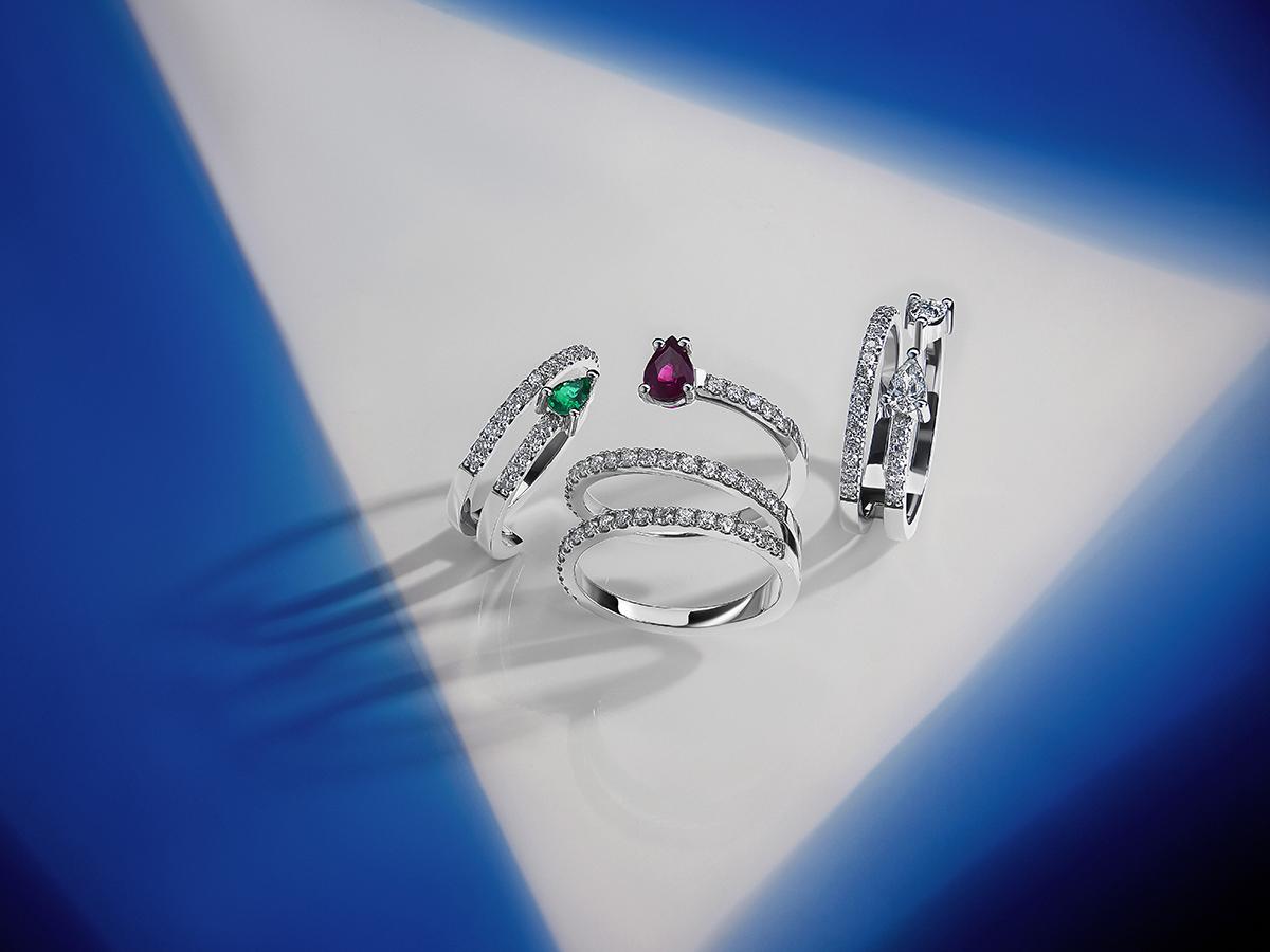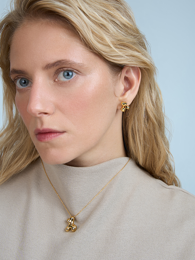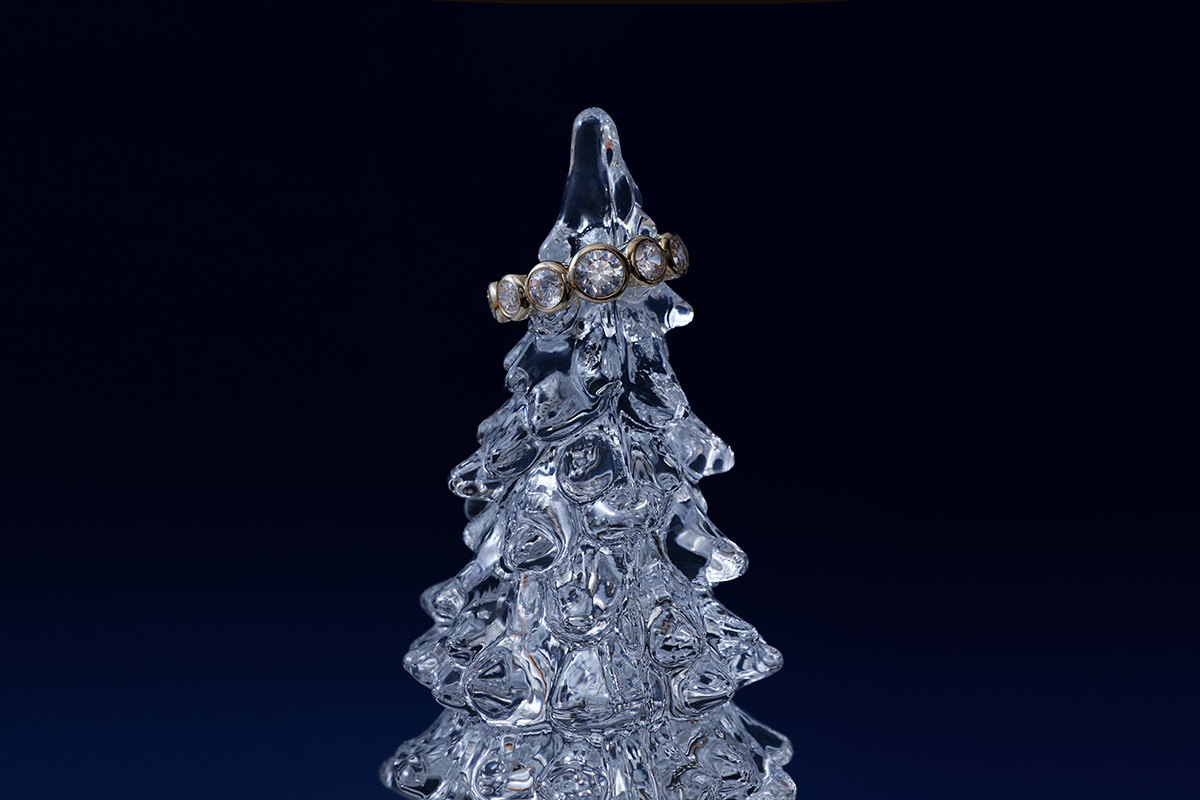 Продолжить новогоднюю тематику можно через символизм украшений. Вы можете остановиться на читаемых и реалистичных дизайнах, чтобы у зрителей не было сомнений в том, что они видят. Или уйти в сторону абстракций, где объемный полированный металл играет в намеки на формы. Во втором случае рассмотрите стилизацию с дублями: когда вы носите вместе одно и то же украшение в золоте и серебре.