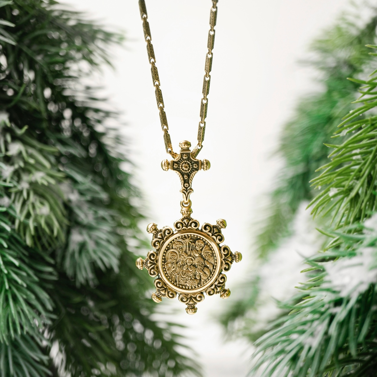 В рождественской коллекции Владимира Михайлова этот многовековой сюжет обретает новое дыхание. На круглой, подобной солнцу розетке, украшенной нитью кринов – лилий, символов чистоты, – разворачивается тонко проработанная сцена Рождества. Здесь и склонившееся над Младенцем Святое Семейство, и персидские цари-волхвы с дарами, и простодушный пастушок. Каждая фигура включена в единую гармоничную композицию, напоминая о вселенском масштабе события. На оборотной стороне, как драгоценная печать, начертан кондак праздника.