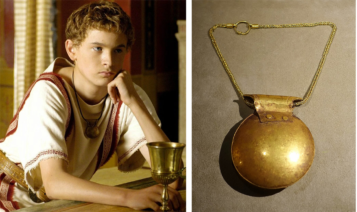 слева: кадр из сериала "Рим" HBO (2005-2007). Молодой Гай Октавиан Цезарь в тоге для мальчиков и со своей буллой.