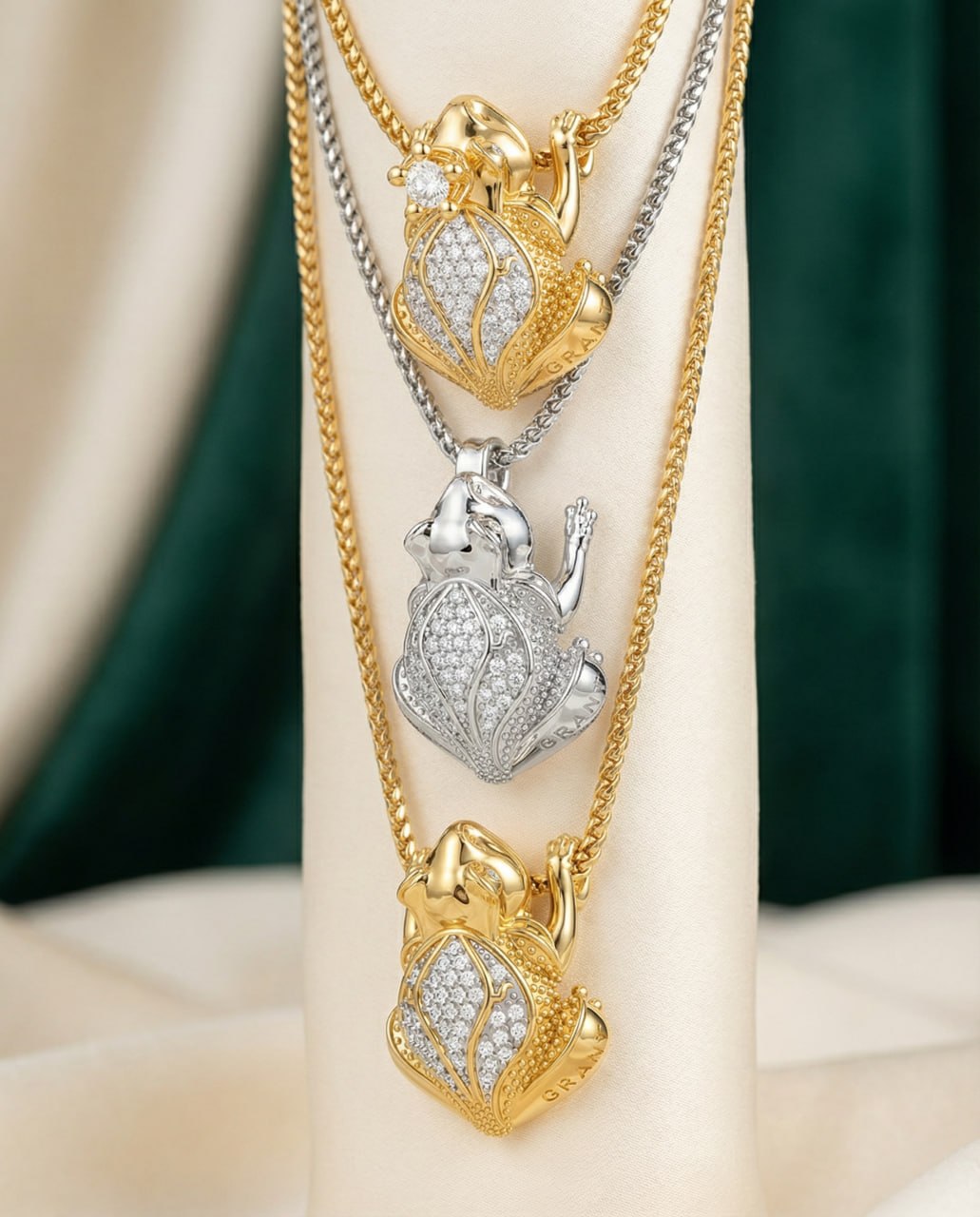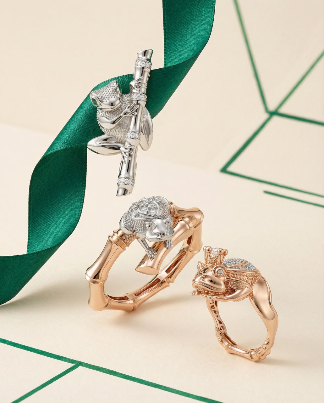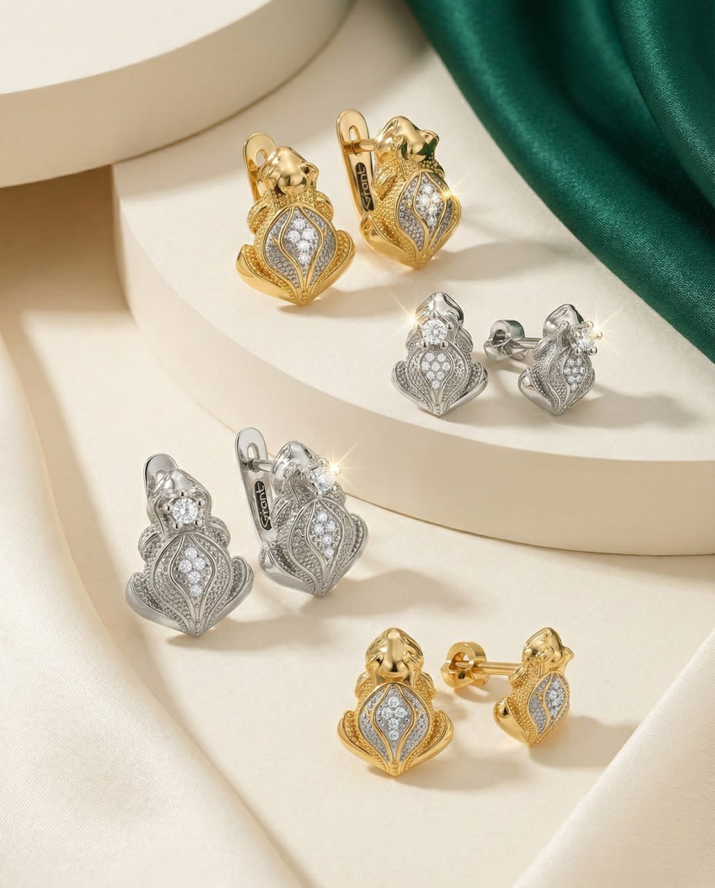 В коллекции GRANT «Frog Style» античный символ обрёл новую жизнь. Природные бриллианты, проработанная фактура кожи, золото 585 пробы. Серьги, брошь, кулоны и кольца — для тех, кто помнит: настоящая любовь всегда немного загадочна. И блестит.