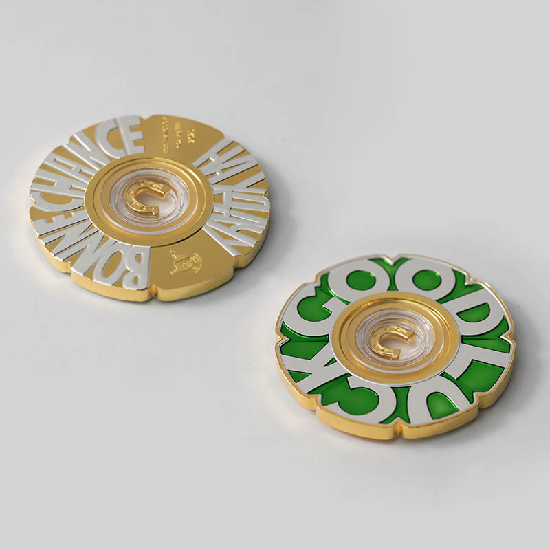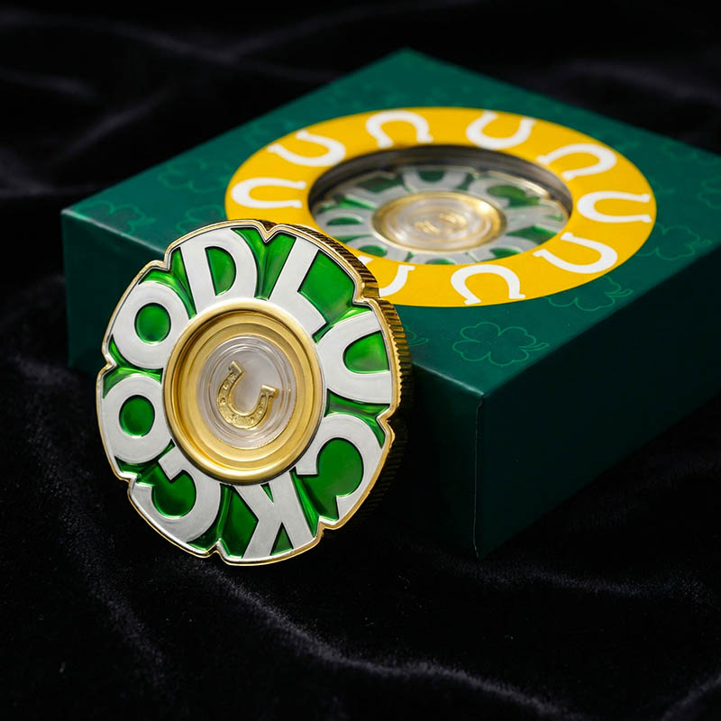 Реверс продолжает заложенную идею. Рельефные слова GOOD LUCK формируют композиционный центр, а пространство между ними заполнено прозрачной зелёной эмалью. Центральная капсула с подковой объединяет обе стороны монеты в единый образ, усиливая ощущение цельности.