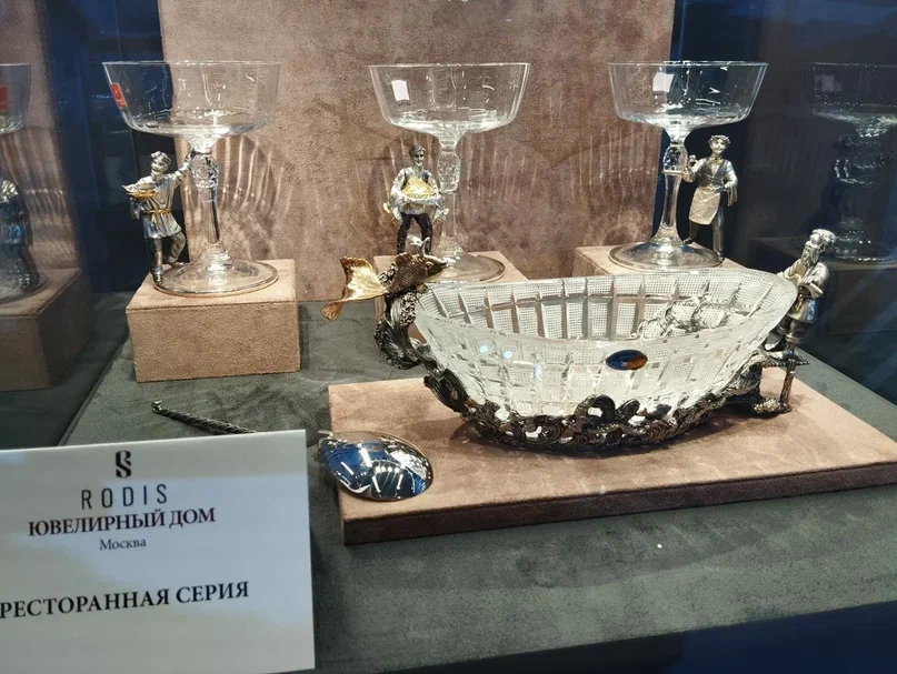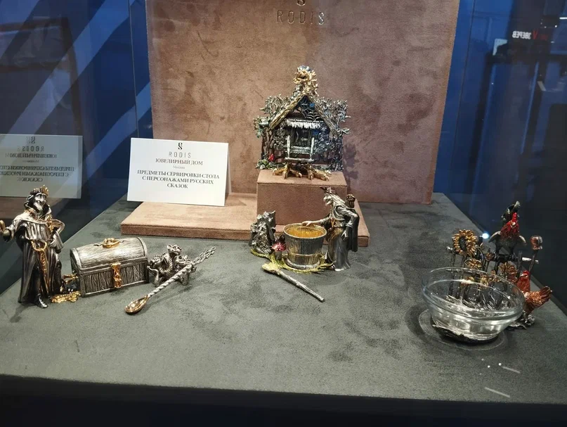 На нашей выставке было представлено, например, уникальное изделие Золотых дел мастерской «Хризолит», которое создавалось мастерами пять лет: настольная лампа «Сказы Амура» по мотивом сказки «Конёк-Горбунок». Здесь же мы видим потрясающие тиары, которые заимствовали мотивы русского кокошника, потрясающие броши, навеянные образами русских сказок. Ильгиз Фазулзянов, выдающийся ювелир нашего времени, здесь презентует свой небывалый проект, в рамках которого он планирует воплотить в ювелирном исполнении образы 123 национальных костюмов различных народов России. Что касается «Ботика Петра I», выполненного Ювелирной компанией RODIS, то его прообразом является изделие фирмы Павла Овчинникова, демонстрировавшееся на Политехнической выставке 1872 года в Москве. Тогда эта модель стала призом в состязании гребных судов Москвы и Петербурга и была заказана Морским министерством к юбилею Петра I. Причем экспонаты выставки тогда послужили основой для создания Исторического музея в Москве. Сегодня история повторяется на новом витке, и уже современное изделие, переданное в дар на Московском финансовом форуме, становится достоянием и частью экспозиции Государственного исторического музея».
