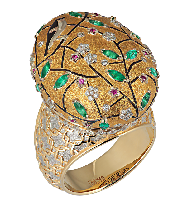 Кольцо «Япония» (на фото) из коллекции «DEA» (Gevorkyan) – это изысканная интерпретация японского сада, микрокосма, где царит гармония философии. Внутри ажурной конструкции из платины и золота, подобно цветущей сакуре, распускаются бриллианты, изумруды и рубины огненного оттенка, что отражает традиции японской эстетики, воспевающей красоту природы.
