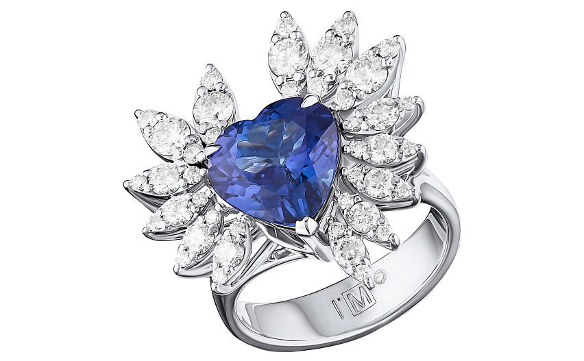 Ivan Markov Jewelry представит кольцо «Сердце Востока» (на фото) , в центре которого – крупный танзанит огранки «сердце», от которого расходятся лучи-звезды, инкрустированные бриллиантами. «Сердце Востока» излучает мудрость, манит взгляд и ведет к новым открытиям.
