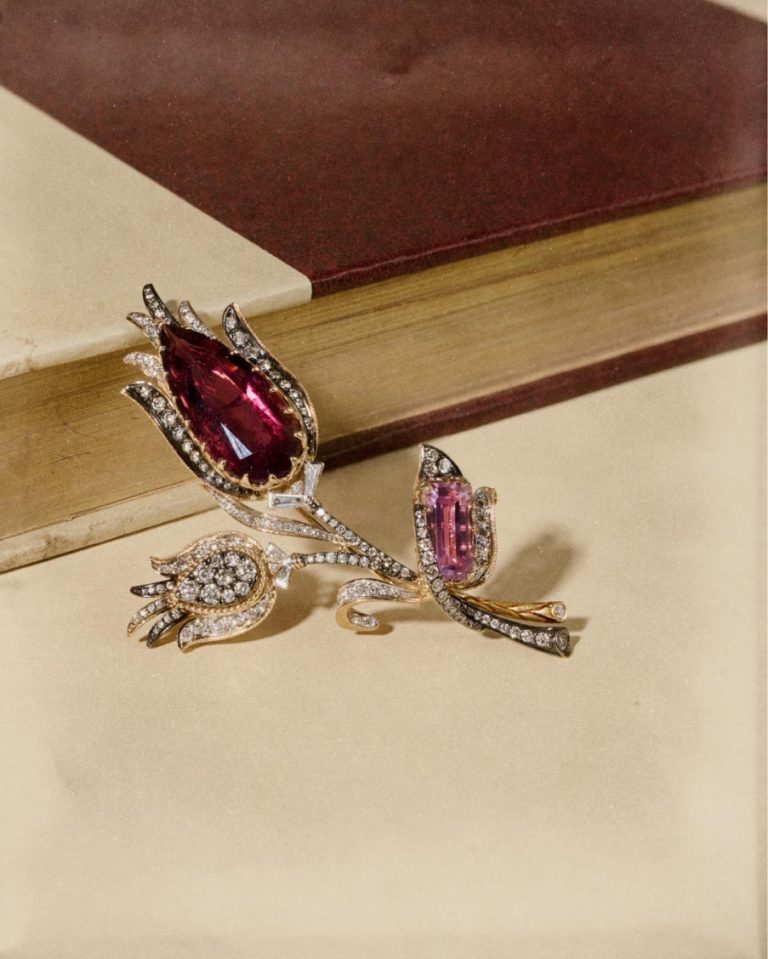 Брошь в виде цветка, украшенная драгоценными камнями и бриллиантами. От Sensual Jewels.