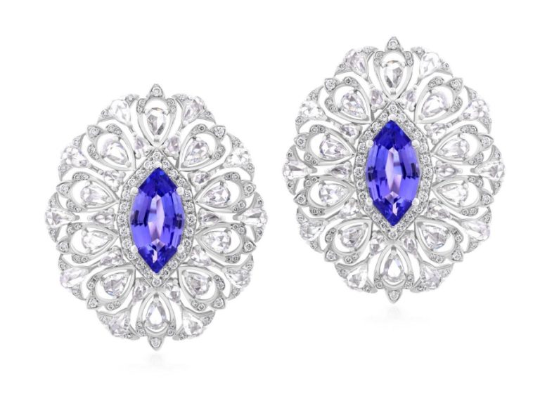 Эффектные серьги-гвоздики, украшенные танзанитами и сияющие благодаря алмазам огранки «роза» и белым бриллиантам. От Oriental Gemco.