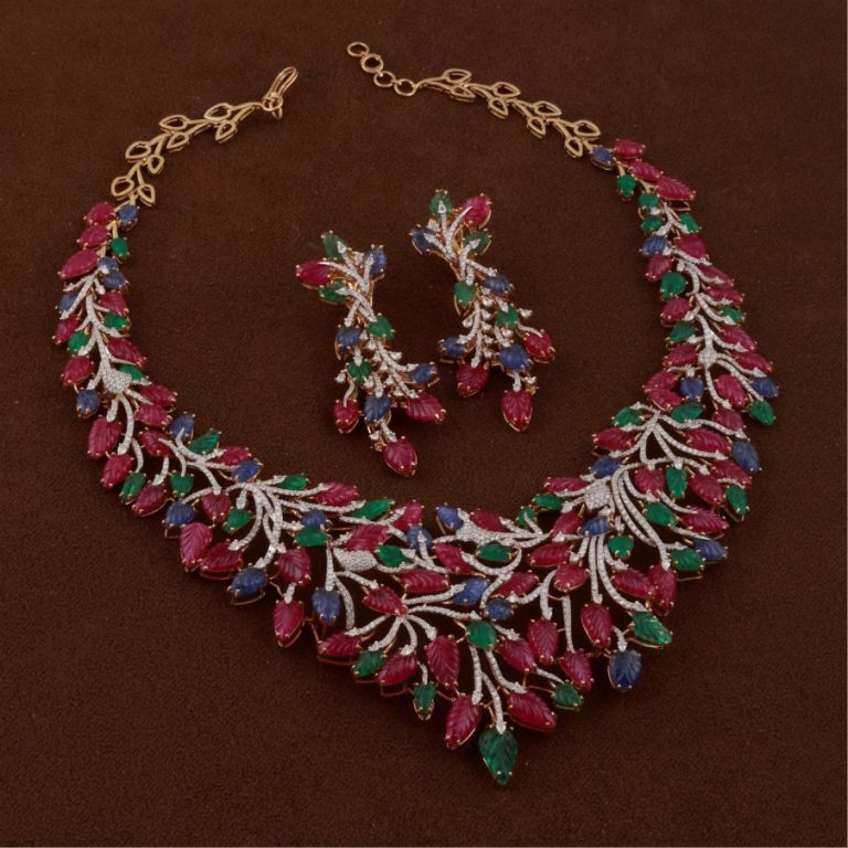 Обилие изумрудов, рубинов и бриллиантов придает этому великолепному ожерелью праздничный вид. (Автор: Manoj Ornaments)