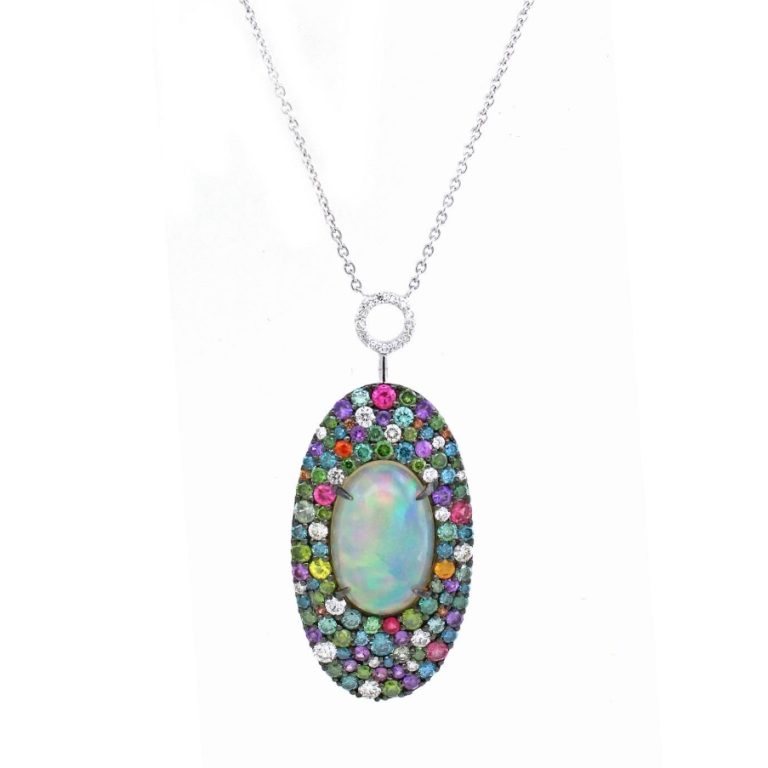 Кулон с овальным опалом, обрамленным множеством разноцветных драгоценных камней. Производитель: Intergem Exports (YS18)