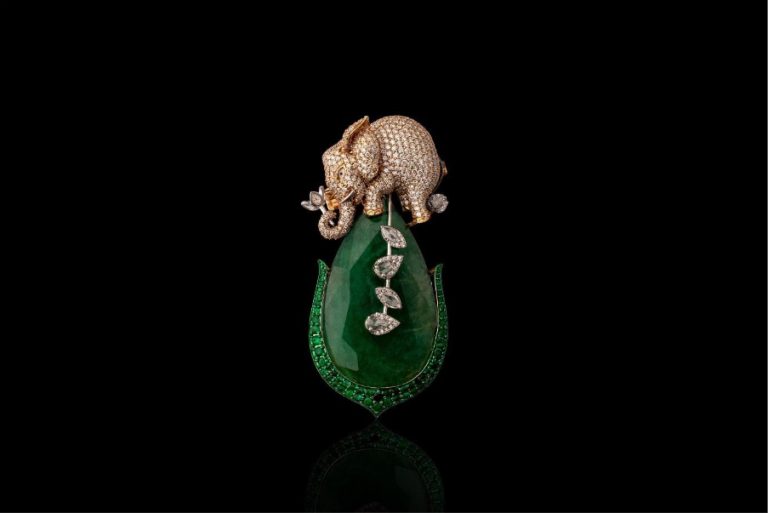 Брошь выполнена в виде крупной изумрудной подвески, на которой сидит слон, инкрустированный бриллиантами. Производитель: D'yne Jewellery.