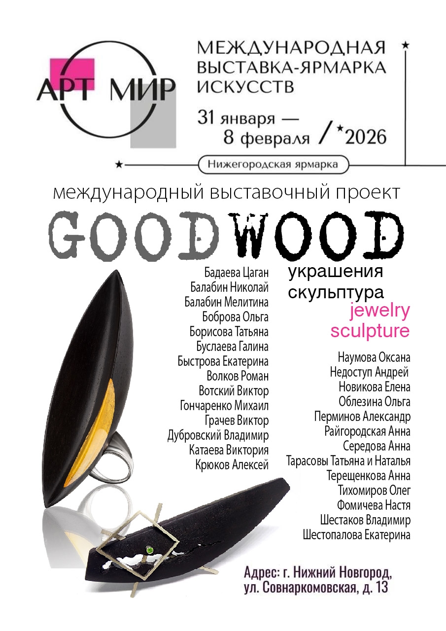 Международная выставка ювелирных изделий и произведений искусства из дерева «GOODWOOD» представит работы 25 художников-ювелиров в рамках всероссийской экспозиции «АРТ МИР». Выставка состоится с 31 января по 8 февраля 2026 года на Нижегородской ярмарке. «АРТ МИР». представляет собой многокультурное пространство, объединяющее современное искусство — от живописи и графики до скульптуры, керамики, фотографии, антиквариата и инновационных форм художественного выражения. Благодаря проекту GOODWOOD, на выставке будет уделено особое внимание уделяется авторскому ювелирному искусству и эксклюзивной скульптуре из натурального дерева.
