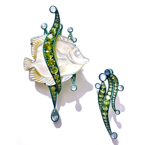 Коллекция Ocean, серьги, перламутровые «рыбки-ангелы» с перидотами и лунными камнями © A.win Siu