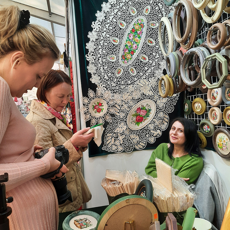Также кружевоплетение, вышивка, изделия из пуха и войлока, авторские украшения, художественные куклы, предметы интерьера, живопись, этническая одежда и аксессуары.