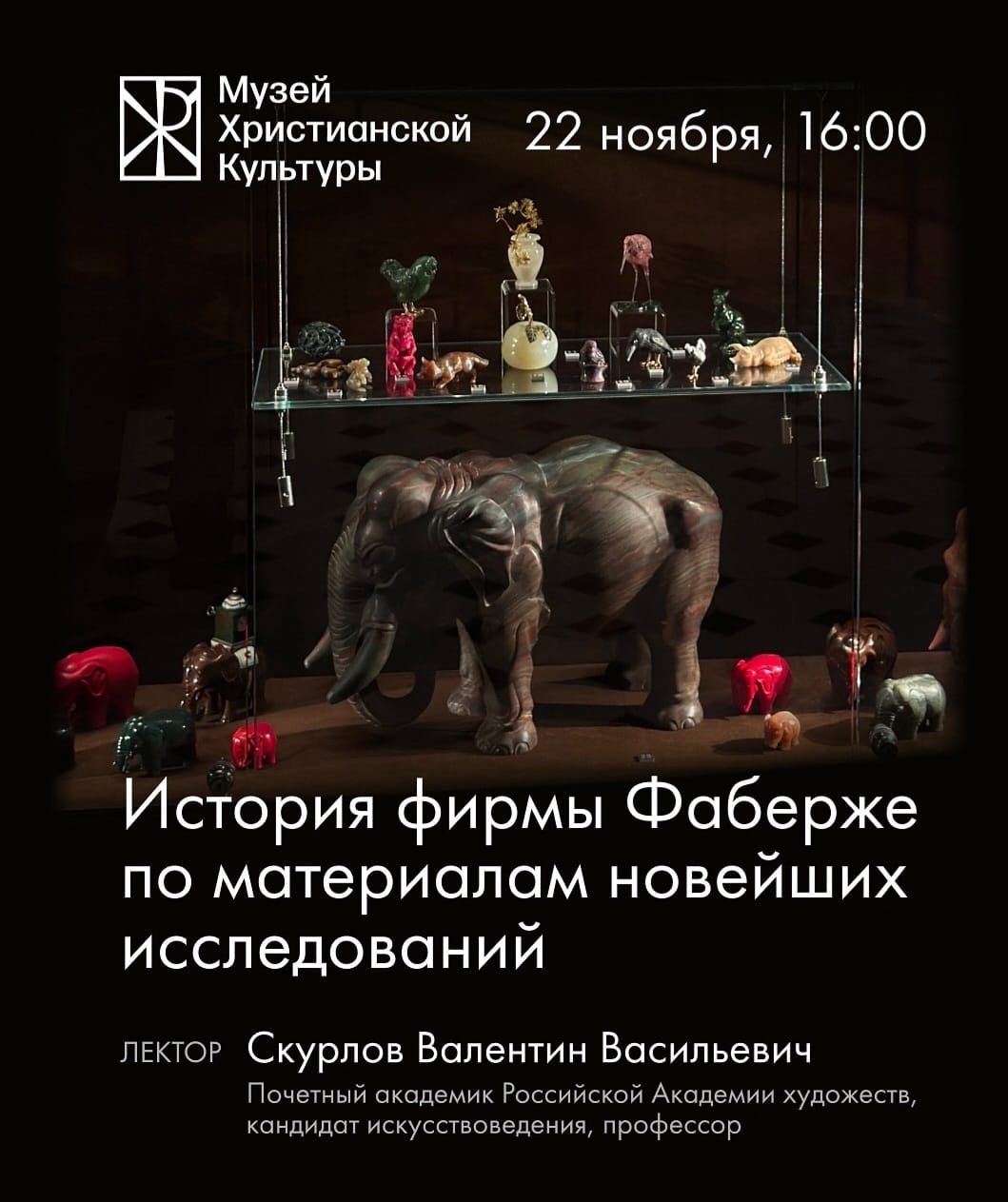 Музей христианской культуры 22 ноября в 16:00 приглашает на лекцию «История фирмы Фаберже по материалам новейших исследований». Спикер — Валентин Васильевич Скурлов, почётный академик Российской академии художеств, кандидат искусствоведения, профессор.