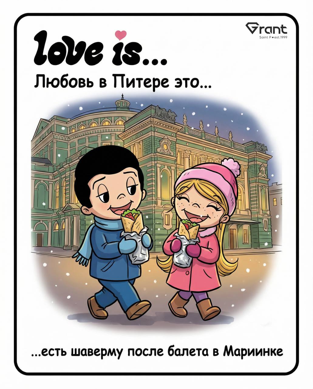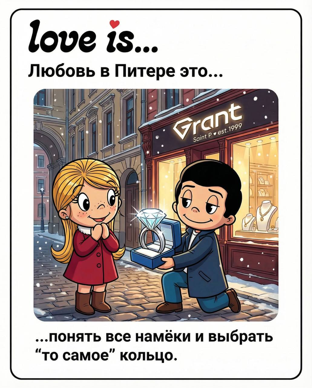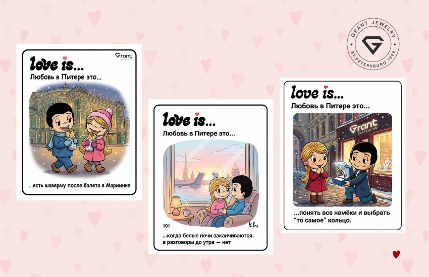 Петербургский ювелирный завод GRANT ко Дню всех влюбленных выпустил серию открыток-вкладышей, вдохновленных культовым форматом Love is…